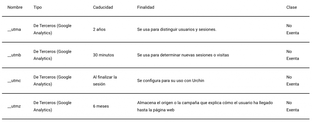 Cómo usa Google Analytics las cookies: https://developers.google.com/analytics/devguides/collection/analyticsjs/cookie-usage?hl=es#analyticsjs
